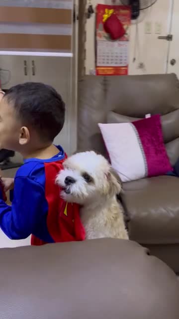 Footage shows the one-year-old Shih Tzu named Bruno with front limbs embraced around four-year-old Raven Paul Palayon's waist as they explored the living room close together in Cavite, the Philippines on November 24.