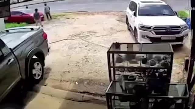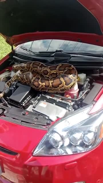 The giant reptile spooked the car owner who leapt back with fright when lifted the bonnet of the red Toyota Prius left near a factory in Sihanoukville on November 24.