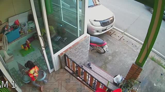 CCTV footage shows the youngster playing with her sister at the front of their home while their mother was busy cleaning their play area in Chiang Rai, northern Thailand, on May 1.