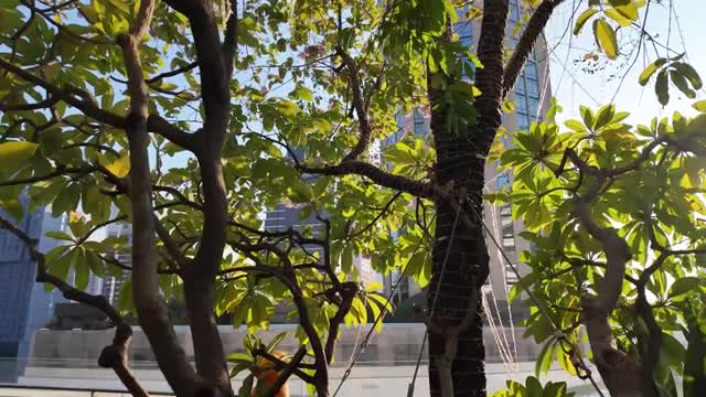 Footage shows a lush walkway lined with trees and plants, decorated with eye-catching yellow and pink sculptures at the EmQuartier mall in Bangkok, Thailand. 2026-01-27 15:41:49