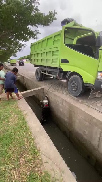 Footage shows a trucker pulling the broken-down vehicle out of a waterway using the trailer's raised dumping function in Kendal Regency, Indonesia. 2026-01-27 15:41:42