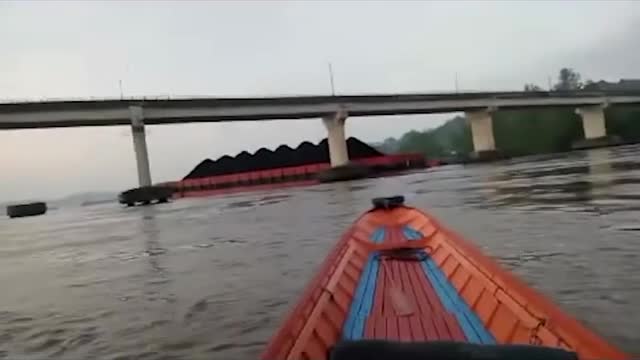 Footage shows the Power 3066 barge wedged against one of the foundations of the Mahakam Ulu Bridge in Samarinda City, East Kalimantan, after it became detached from its tugboat. 2026-01-27 17:52:10
