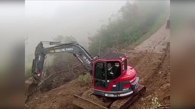 Heavy equipment struggled to remove thick mud from a blocked road in Pianoro, Bologna. Since October 19, firefighters have conducted more than 1,300 regional rescue operations to address widespread damage.