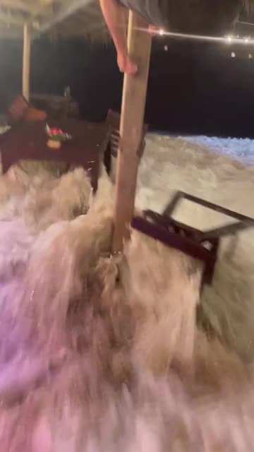 Footage shows strong waves sweeping through tables and chairs, knocking furniture over on a beachside establishment following storms in Phang Nga province, Thailand, on October 16.
