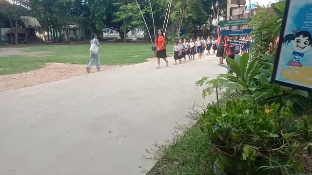 Footage captured by Chhum Sothea shows schoolchildren walking in line, with an older student guiding them from the front in Phnom Penh on July 9. 2024-10-11 13:24:28