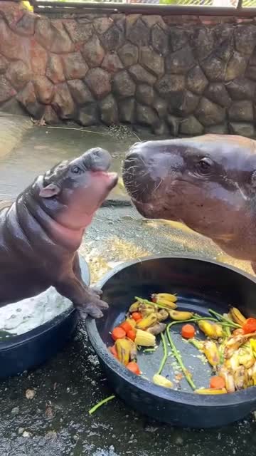 Footage shows the pygmy water horse eating with her mum while in a water-filled basin at Khao Kheow Open Zoo in Chonburi, Thailand, on October 8. 2024-10-11 11:15:33