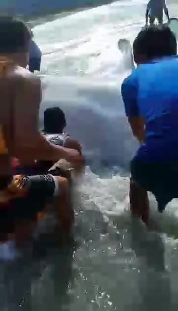 Footage shows the 30ft marine animal lying on its back in the shallows while residents helped return it to the depths in Ilocos Norte, the Philippines, on September 16.