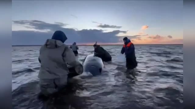 Footage shows state emergency services and volunteers splashing buckets of water on the sea creatures trapped in shallow waters near the Kamchatka Peninsula.