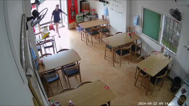 Footage shows a young woman carrying groceries into a restaurant for the kitchen when a motorbike suddenly crashes after her in Guangdong, China, on September 22. 2024-10-03 14:01:18