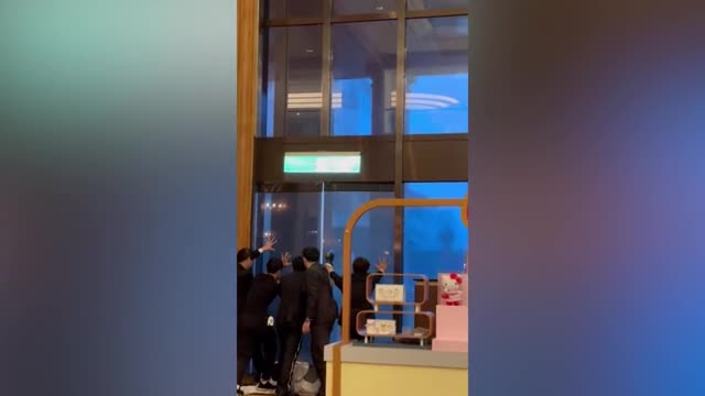 Footage shows employees working together to keep the glass doors closed against the powerful gusts of wind in Kaohsiung on October 3. 2024-10-03 14:07:31