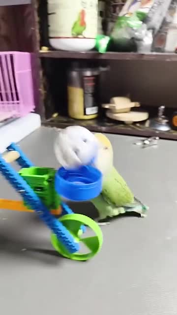 Footage shows the green budgie grabbing a small blue-and-white ball in its beak and placing it into a holder attached to the front of the bike in Jiangsu, China. 2026-01-22 14:21:02