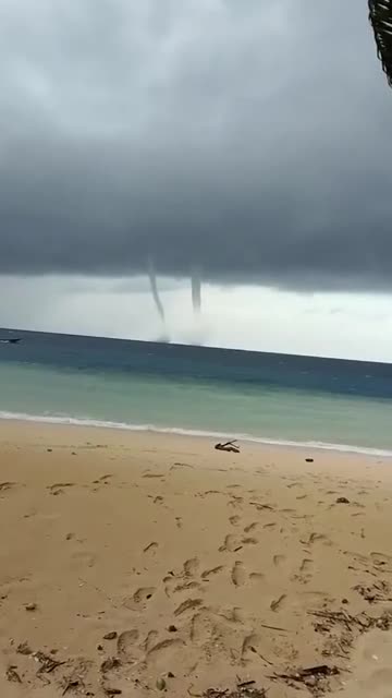 Footage captured by Tiya shows the rare triple vortices stretching to the clouds as they swirled on the horizon and whipped the ocean near Pulau Hatta, Banda Islands, Maluku province. 2026-01-22 18:33:49