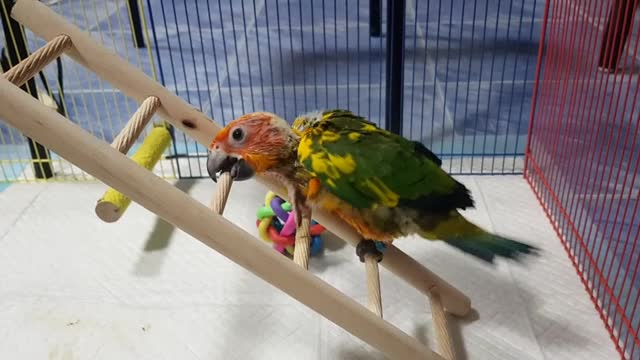 Parrot learns to climb up ladder