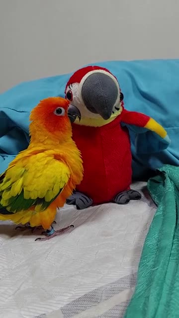 Footage shows the sun conure named Moo Ping biting and pecking the plushie that mimicked sounds as it flapped its wings in Bangkok, Thailand on June 8.