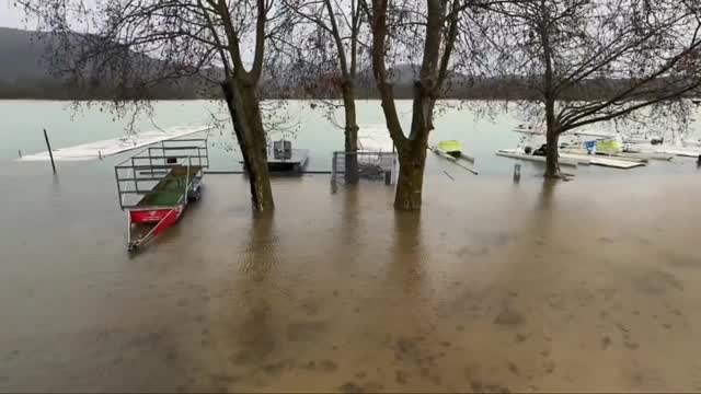 Footage shows submerged walkways, partially flooded green spaces, and boats stranded in unusually high water as the lake swells toward Draga Park following several days of heavy rainfall in Catalonia.