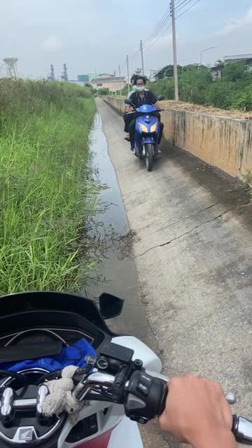 Helmet-camera footage shows the motorist and his partner waiting for another rider to navigate the treacherous pathway in Bangkok, Thailand. 2026-01-21 14:42:49