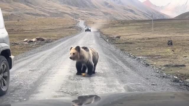 Phone footage captured by Mr Cai near Qamdo in the Tibetan region of China on September 8 shows what appears to be a Tibetan blue bear, one of the world's rarest bear species. The animal is seen walking along a dirt road between a line of SUVs.