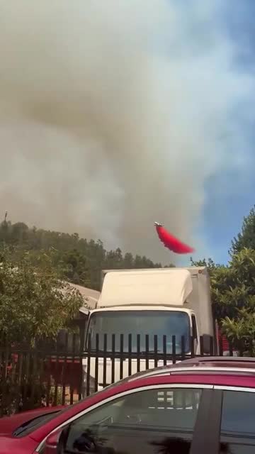Footage captured by Gustavo Pinto Cruz shows a Boeing 737 Fireliner making its third drop over the Palomares sector in Concepcion, as firefighters battle intense flames sweeping across the south of the country.
