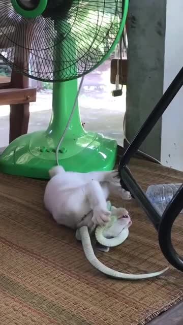 Footage shows the white feline lying on the floor while constricting the fake viper with its limbs in their home in Khon Kaen province, Thailand on August 28.