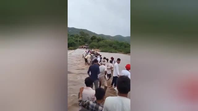 Footage shows the Devasi community in a long line working together to rescue the farm animals swept away by the strong currents of the Mirpur River in Sirohi district, Rajasthan, on August 30.