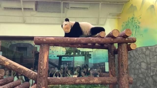 Footage shows Katyusha, Russia's first giant panda cub, holding a basket in her mouth while moving along logs in her enclosure in Russia on August 30. 2024-09-05 21:02:43