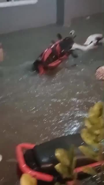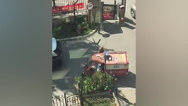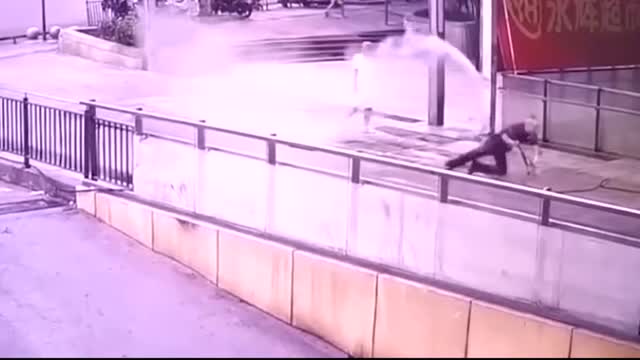 The device appeared to have a faulty connection and as the man stepped onto the wet pavement, he discovered that it was live and became rigid before toppling to the ground in Guiyang, Guizhou province, on August 20.