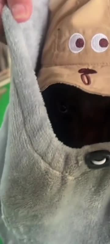 The furry creature, wearing a yellow hat, was spotted curled up inside a large grey sack in Shandong, China.