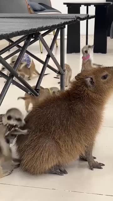The mob of playful meerkats surrounded the motionless giant cavy at the Din-Man Meerkat Cafe in Guangdong, China, on August 17.