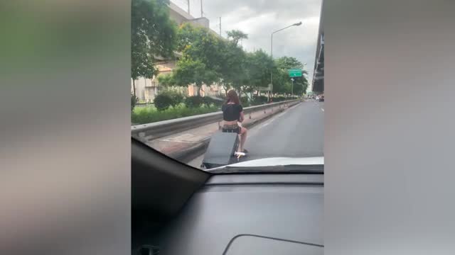 The female holidaymaker sat on top of the pink luggage as she weaved through vehicles during rush hour traffic to reach the Don Mueang International Airport in Bangkok, Thailand, on August 22. 2024-08-23 13:48:41