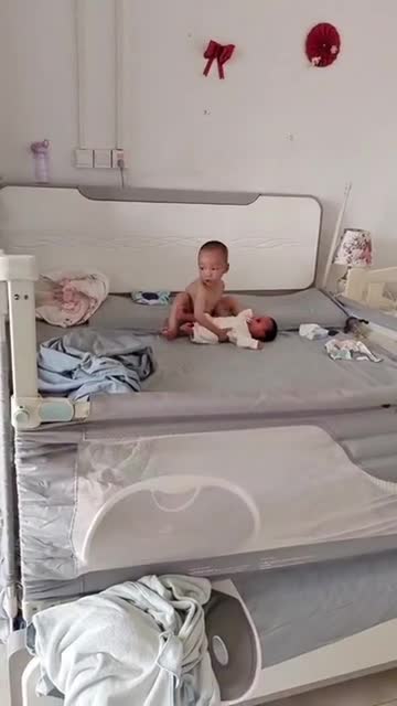 Footage shows the boy holding the infant in his arms and trying to soothe him until their mother returned in Guangxi, China on July 23.