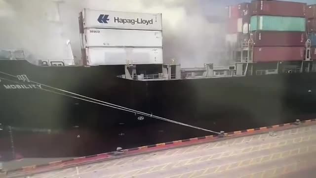 One of the containers on the bow of the cargo ship YM MOBILITY 079W, docked at Beilun Port Terminal in Zhoushan Port, suddenly blew apart, causing a massive mushroom cloud and scattering debris in Ningbo, Zhejiang, on August 9.