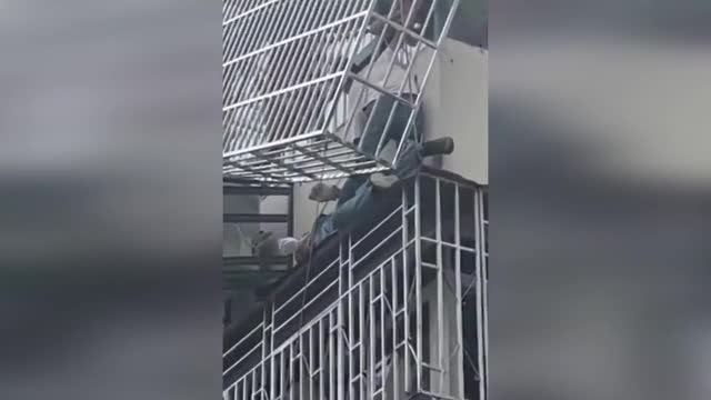 Video footage shows a worker installing windows in Chuzhou in Anhui, China being heroically rescued by firefighters after he was left immobile due to electrocution on a narrow security window. 2024-08-01 11:07:57